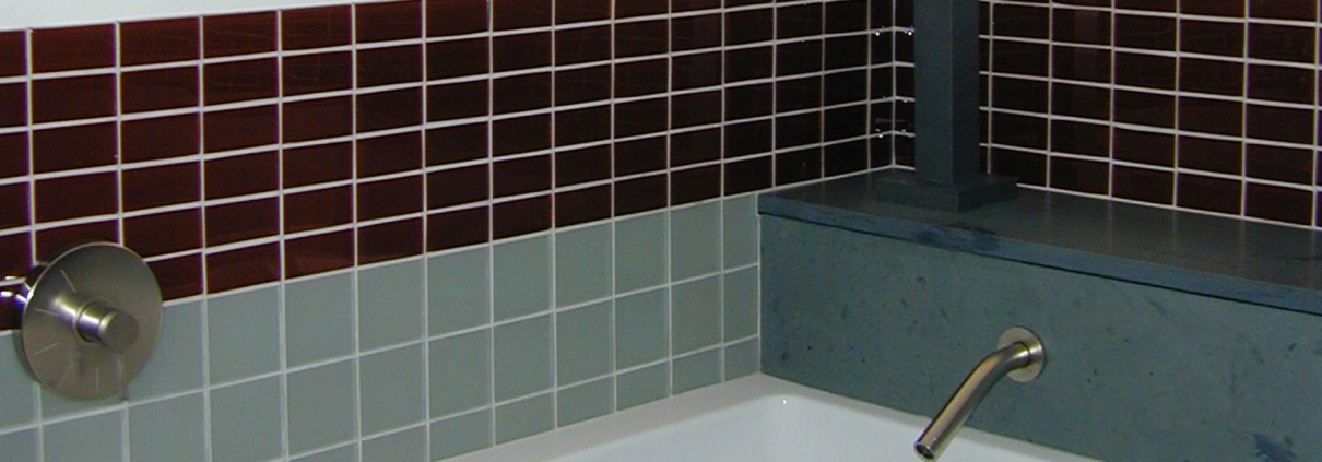 Clean lines and a contemporary design with glass tile and modern plumbing fixtures.
