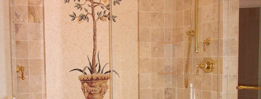 Rich mosaic and stone tile – warm colors for an elegant Master bath retreat.
