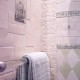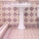 Beveled ceramic subway tile with chair rail and stripped upper shower walls.